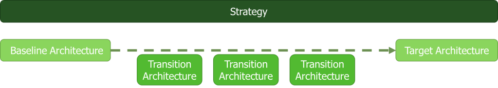 Working with only Baseline and Target Architectures can be challenging because the gap between them is often significant. Managing a transformation as a single, monumental leap is impractical. To address this, organizations can aim to deliver value incrementally and in phases, leveraging “Transition Architectures” as milestones toward the Target Architecture. These Transition Architectures provide an evolution of architectural descriptions towards the Target Architecture.