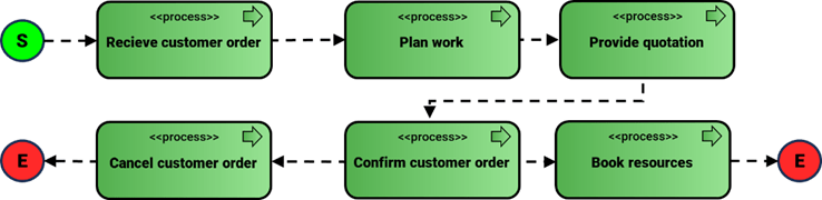 The relationships in this view are flows, showing the direction of travel to each element. A process may have several flows connecting to other processes, start points, or end points. The stereotype detailed on the process can be used to indicate different types of processes — for example, internal or external processes.