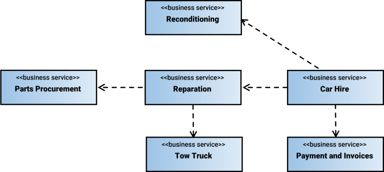 Visualizing the dependencies between business services helps the architect identify critical chains of services in the organization. Understanding the dependency flows supports the architect in a number of analytical tasks, such as the impact of change, identification of security-critical services, and candidates for rationalization and consolidation.